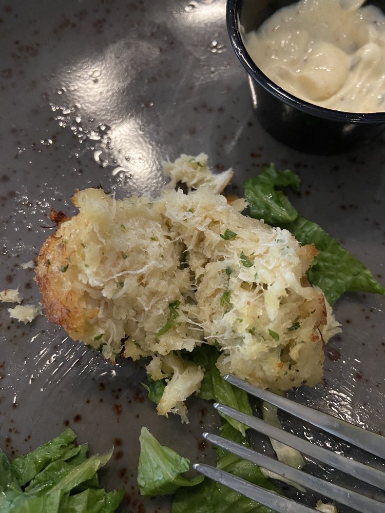 Two crab cakes, shoestring fries, remoulade sauce, served with coleslaw